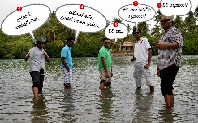 මචන් ලස්සනට ඉදහල්ලා කවර එකට පොටෝ එකක් ගන්න. ඒ කෑගැහුවේ වතුරට බැසීමට බැරිව ලතවෙන ගවේෂකයාය. අපි සම්භාව්ය ලෙස සිට ගත්තෙමු. කෙලවරේ සිටි මං රජාගේ විලුබ ප්රදේශය කවුරුන් හෝ අඩු දෙකකින් අල්ලනවා වගේ දැනුනි. එක වරම හයියෙන් අල්ලුනි. මට වැඩේ මීටර්ය.... @#$% කක්කුට්ටෙක් වගේ දෙයක් ඇසේනවාත් සමගම චිටිස් ගා පොටෝ එකක් වැදුනි.