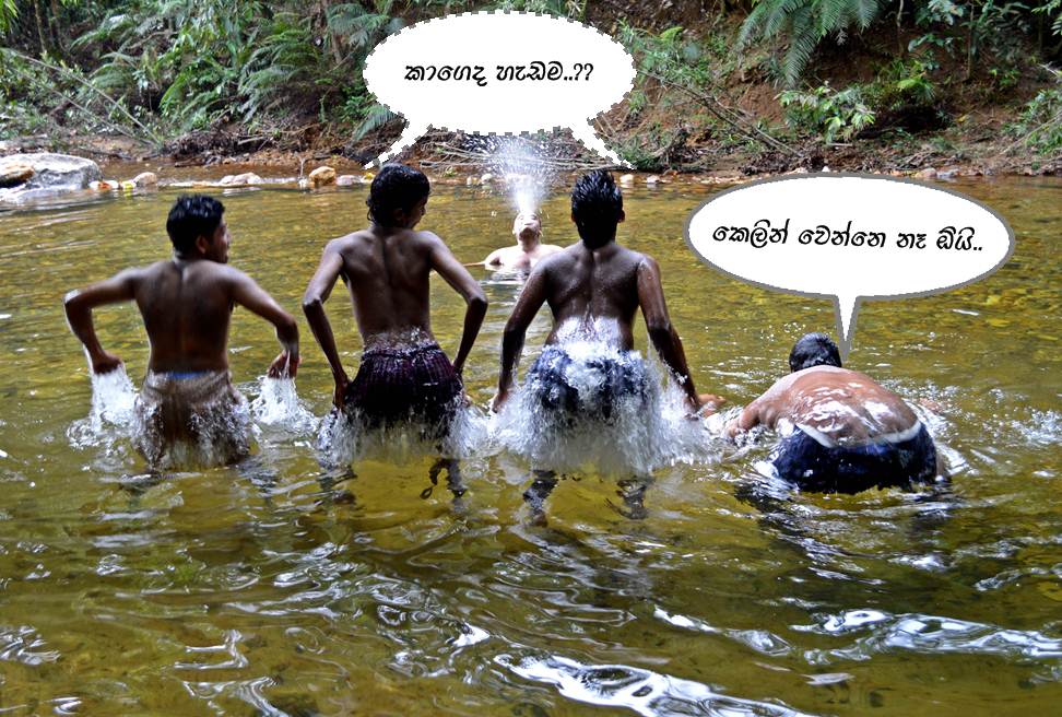 නැවත බෑග් අරන් පැමිණෙන විට කෙල්ලෝ රංචුවේ ටික දෙනෙක් ගේට්ටුව ලඟට ආවෝය. ගවේෂකට ආයෙත් මහන්සිය. බොහොම අමාරුවෙන් ඌව ඇදගෙන තොටුපලට ආවෙමු. ඒ එන අතර මග නාන ගැන්සියේ කෙල්ලෝ ටිකක් අප කැමරා කාචයට හසු විය.
